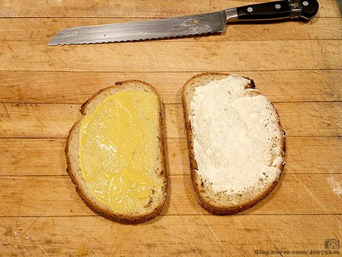 개인적으로는 사워도우나 통밀빵을 선호합니다. 길이가 길쭉해서 재료를 이것저것 마음껏 올릴 수 있거든요. 여기에 한쪽 면에는 허니 머스타드를, 다른 한 쪽에는 마요네즈를 듬뿍 발라줍니다. 소스는 맛을 더하는 역할도 하지만 재료의 수분으로 인해 빵이 눅눅해지지 않도록 보호하는 방수 효과도 있습니다.
