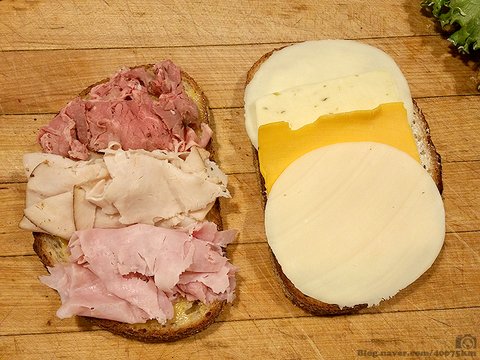 고기를 샌드위치에 올릴 때 명심해야 할 것은, 얇게 썰린 채 차곡차곡 쌓여있는 고기를 그대로 올리는 것이 아니라 구불구불하게 접어가며 겹쳐 올려야 한다는 점입니다. 그래야 보기에 볼륨감이 있어서 먹음직스럽거든요.