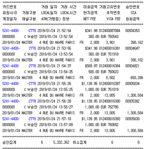 물론 저는 그간 해외 여행 중에 태국 등지에서 소액으로 몇 번 현금을 인출한 적이 있었습니다. 그런데 이런 식으로 연달아 고액이 인출되는 것이 가능하다는 것, 그리고 이렇게 제가 그간 사용한 적이 없는 해외(프랑스 파리는 10년 만에 방문한 것입니다)에서 이렇게 허술하게 단 한번의 비밀번호 입력으로 현금인출이 가능하다는 사실과 그에 따른 위험성은 고지 받은 적이 단 한번도 없습니다.
