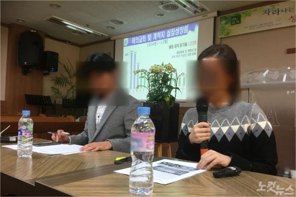 신천지와 만민중앙교회 탈퇴 청년들이 22일 경기도 구리시 구리이단상담소(소장 신현욱 목사)에서 증언하고 있다.