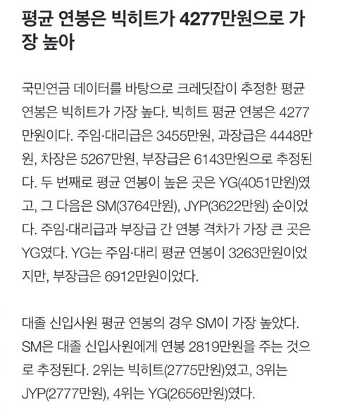와이지는 부장급 연봉은 제일 높은데 신인 연봉은 제일 낮음 직급별 격차 제일큼
