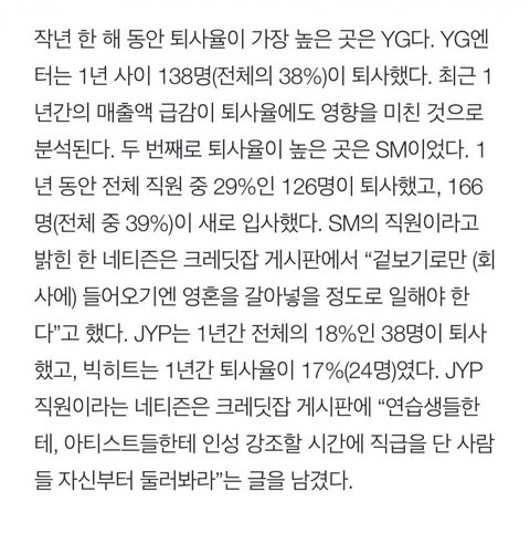 YG 직원수: 360명. 퇴사: 138명 (38%)