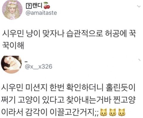 렬리티에서 기분업되면 습관적으로 콧노래 부르면서 꾹꾹이가 절로 나오는 시우민 당신을 빼박 고먐미 수인으로 이응지읒합니다!!!