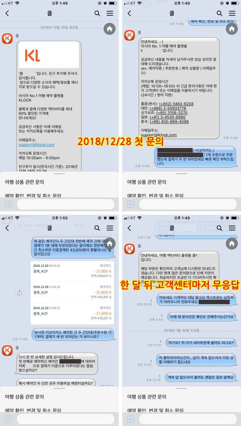 하지만 3~4일 후에도 어떤 연락이나 환불처리가 되지 않았고저는 오로지 카카오톡 플친으로만 운영되는 한국 고객센터에 직접 다시 문의를 했습니다.