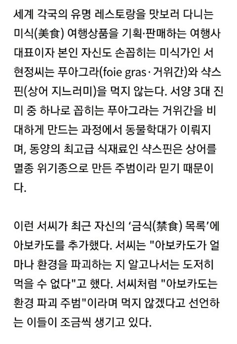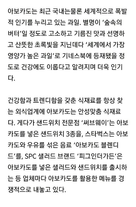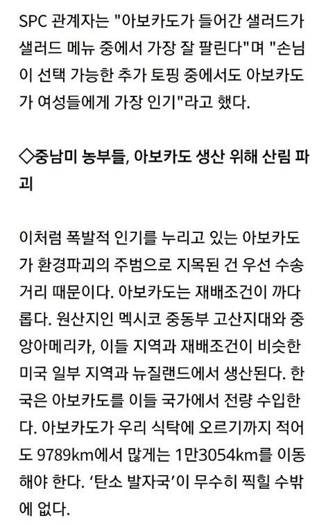 한국에서도 아보카도를 먹지 않는 이들이 생겨나고 있지만 아직은 미미한 수준이다. 써브웨이 관계자는 "환경파괴 주범이자 마약상 돈줄이라고 알려졌다지만 아보카도 관련 제품은 매출 추이에 별다른 변동이 없다"고 했다.
