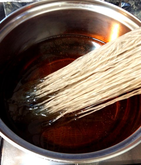 제일 먼저 간장 2숟갈에 참기름 약간 넣고 당면을 넣고 8분간 삶아요. 물을 많이 넣지 않고