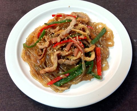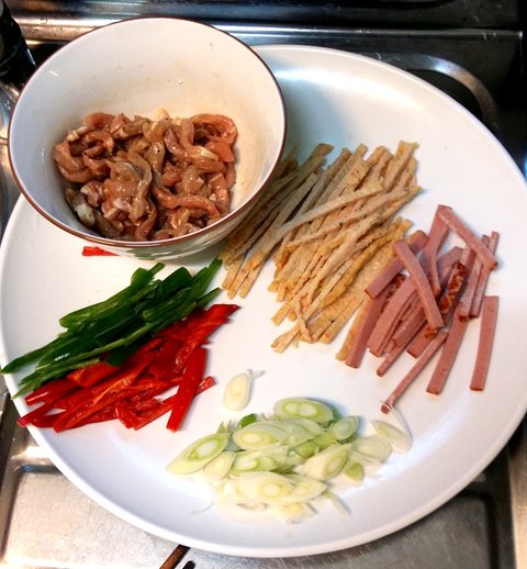 재료: 당면 100g, 돼지고기 잡채용 200g, 피망 1개, 홍고추 2개, 청양고추 1개, 어묵 1장햄 1장양념: 간장 3숟갈, 굴소스 1숟갈, 설탕 1숟갈, 치킨스톡 반숟갈, 참기름, 참깨