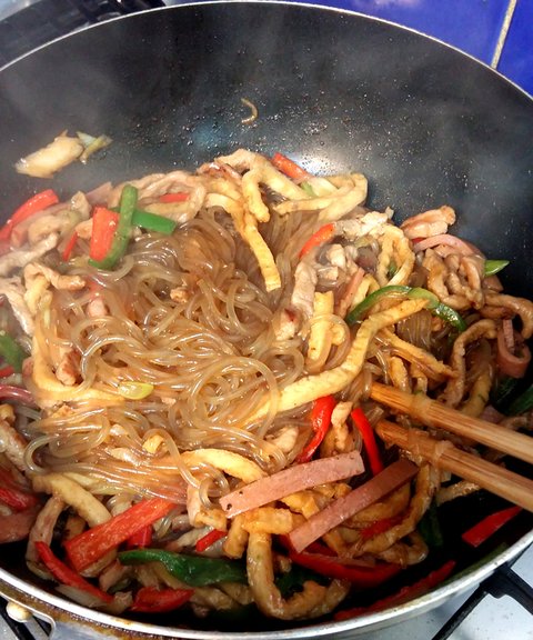 당면을 넣은후에 간장, 굴소스, 설탕, 치킨스톡을 넣고 잘 섞어준후에 불을 세게하고 볶아