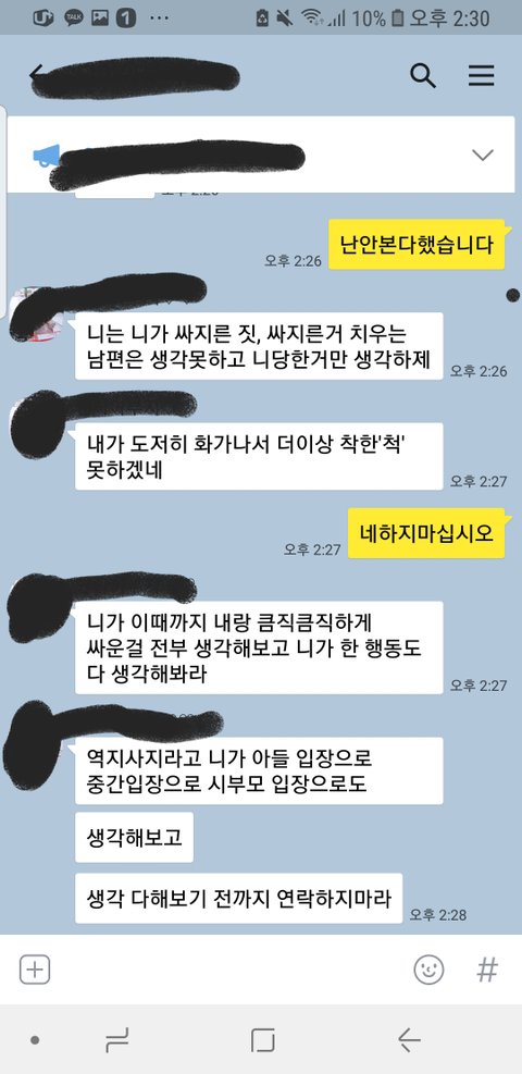 물론, 거기엔 화난다해서 남편에대한 폭언 폭행도 없을것이며 근데 또한 남편의의견을 수용할생각이 없습니다
