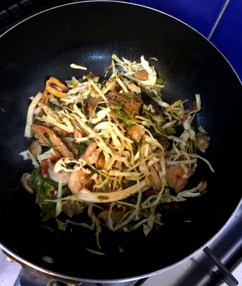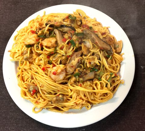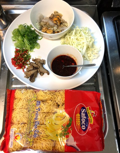 재료: 에그누들, 홍합,바지락,새우, 양배추, 대파, 표고버섯, 홍고추, 청양고추양념: 라조장 1숟갈, 고추기름 1숟갈, 굴소스 1숟갈, 설탕 1숟갈, 간장 1숟갈