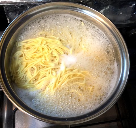 에그누들을 끓는물에 3분동안 삶고 찬물에 헹궈준후 물을 다 빼주세요.