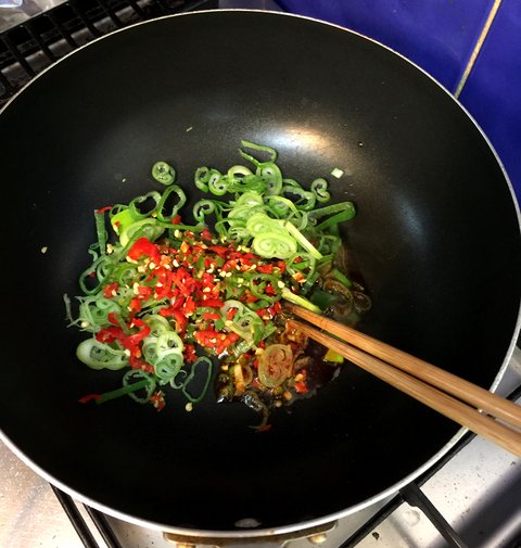 고추기름을 두르고 대파를 넣고 볶아서 향을 내줍니다. 고추기름이 없으면 식용유에