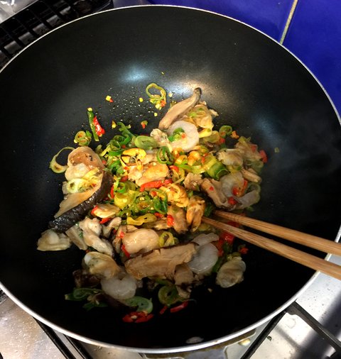 해산물과 표고버섯을 넣고 볶다가 간장과 청주 혹은 미림을 살짝 넣고 볶아주세요