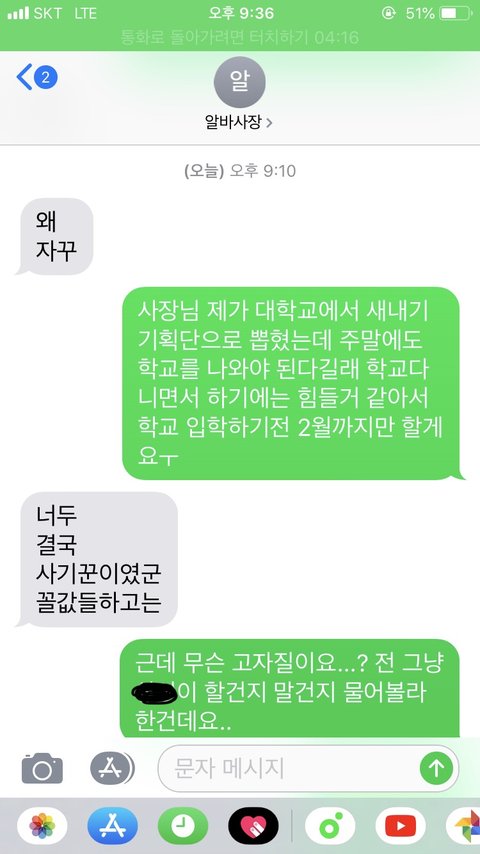 A가 문자를 보냈지만 답장은 오지않았고 결국 a는 겨우 한달이었지만 그래도 열심히 일했던 일터에서 수고했다는 말한마디 못듣고 일을 그만두게되었습니다.