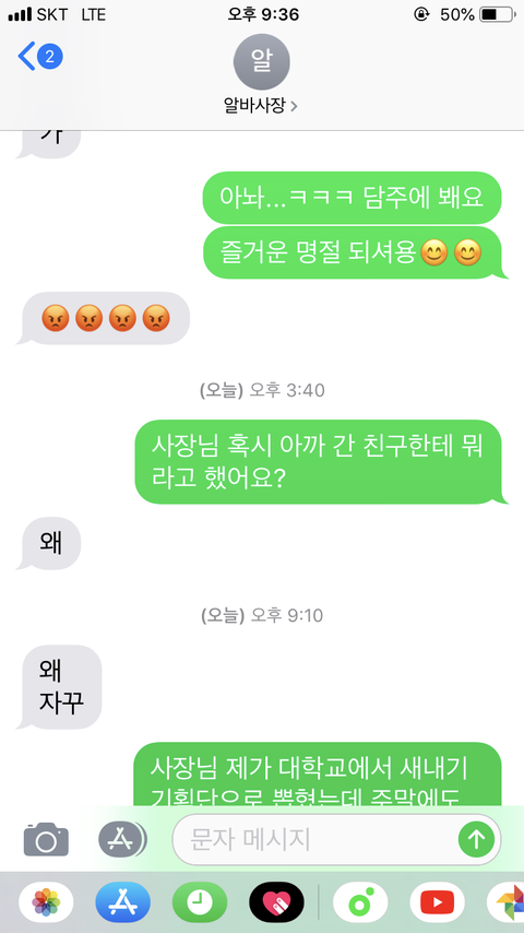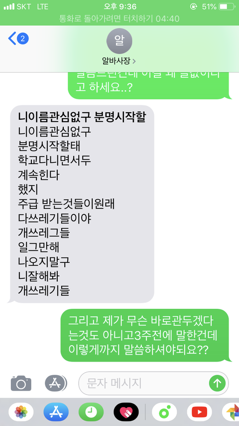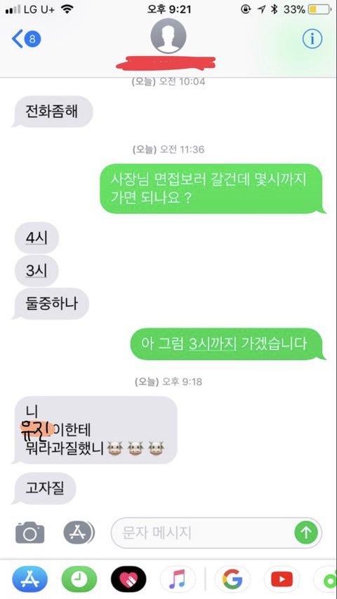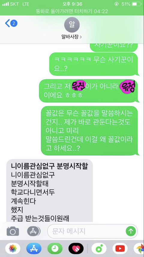 사장은 a에게 알겠다는 말 대신 유정이에게 전화를해서 a욕을 했다고 하네요 a이름을 대며 00년이라며 욕을 서슴치않았고 <정말 화가난다, 원래 그러는 애냐>며 실컷 욕을 한후에 마무리로 유정이에게 다른 알바할친구좀 구해오라고하고는 전화를 끊었습니다.(사장님은 알바몬이나 알바천국에 올리는대신 유정이에게 항상 알바할 친구좀 알아보라며 부탁이아닌 명령조로 말하곤했어요 왜인지는 정확히 모르지만 아마도 돈이 드는게 아까워서겠죠,)