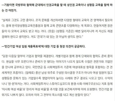 여가부 장관이 군대 인권 교육까지 고민하네ㅋㅋㅋ 군대에서 군인들이 페미교육까지 받아야하나