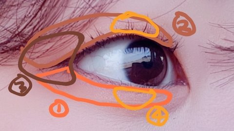 섀도우는 언더쪽에 1번 살살 발라준다음에 눈두덩이위에 2번 바르고 눈꼬리쪽에 3번 발랐어! 그다음에 아라 그리고 뷰러랑 마스카라 해주고 4번 섀도우는 정면봤을때 눈동자 위치쯤에 얹어줬어