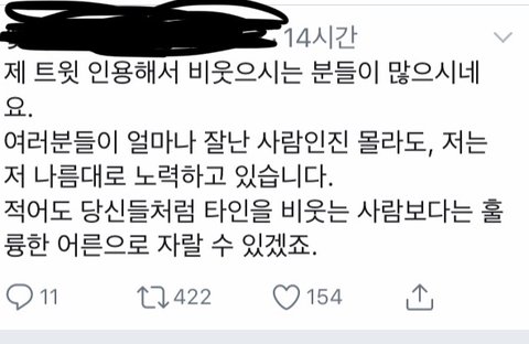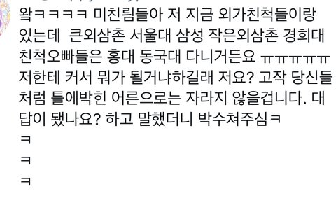 자꾸 판이 주작 더 심하다는 사람들아 ㅋㅋㅋ 판은 그럴싸함╋공감되는 주작을 치는데 트위터는 걍 조카 오글거리는 정의롭고 지가 꼭 승리하는 그런 류의 자작을 치잖아 객관적으로 누가 더 한심하냐