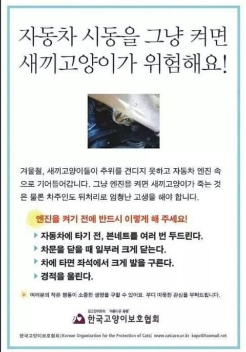 냥이들은 추위를 많이 타는데 애들이 너무 추우니까 온기가 있는곳 찾다가 저렇게 차 엔진안에 들어가는 경우가 많대ㅠ