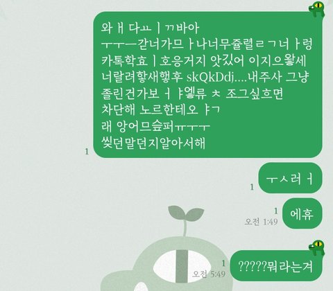 친구때문에 속상해서 폰으로 영화보면서 새벽에 혼자 술 먹었는데 취한 김에 카톡이나 보내야지~ 하고 보냈던거 같은데 아침에 일어나서 보니까 나도 뭐라 보냈는지 모르겠다ㅋㅋㅋㅋㅋ....해석좀ㅠㅠㅠㅠ 아무도 모를거 같긴 하지만,,