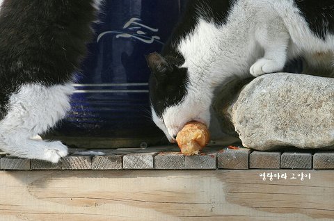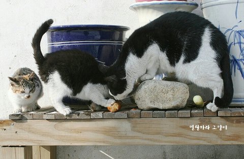 어미 고양이가 크게 한 입 먹고 난 뒤, 아기 고양이에게 양보합니다. 그마저 삼색이 한 마리는 옆에서 입맛만 다시고 있습니다.
