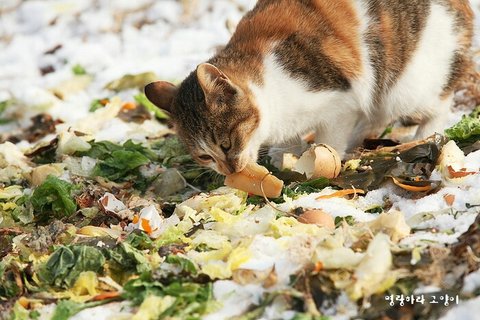 모든 게 얼어붙은 계절, 고양이는 먹을 게 없어 김치며, 언 호박이며, 배추 등 무엇이든 먹어야 하고, 그래야 살아남습니다.