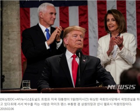 (사진 설명) 【워싱턴DC=AP/뉴시스】도널드 트럼프 미국 대통령이 5일(현지시간) 워싱턴 국회의사당에서 국정연설을 하고 있다.뒤에 서서 박수를 치는 사람은 마이크 펜스 부통령 겸 상원의장과 낸시 펠로시 하원의장이다. 2019.02.06