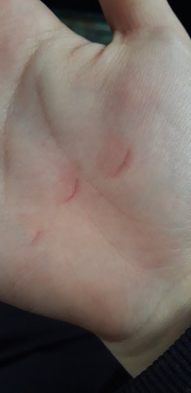 손에 이런 자국 나있음;;;;; 손 이상하게 접은채로 잠들었나봐 저거 손톱자국임