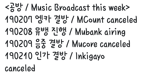 막방은 아니지..? 이번주에 음방 거의 다 결방이던데 이유 아는 캐로시들?ㅠㅜㅜ 음악뱅크 말고 2주연속 1위는 못하는건가.. 왜 다 결방인거야ㅠㅜ