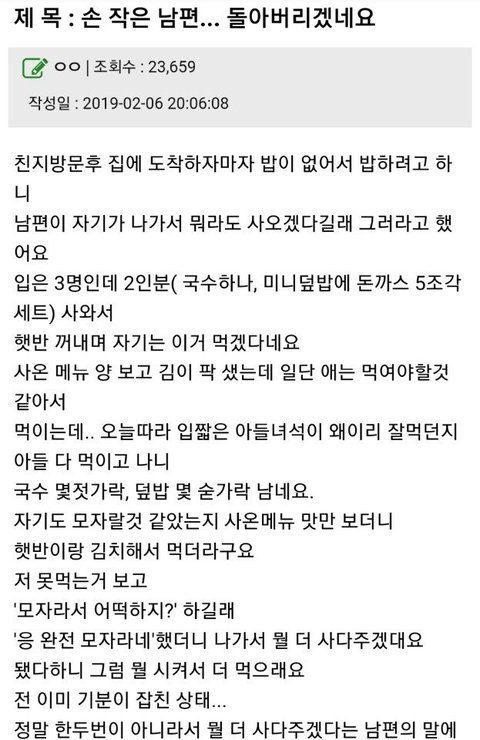 ㅡㅡ남편이 손작은거 알면서 왜 맡긴거야 시켜먹든 본인이 가야지 진짜 먹는걸로 쪼잔하게 구는사람 너무싫음 정떨어짐