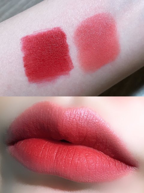 : 어도러블은 연어빛+코랄 색! 베이스로 깔아줄때 자주 사용하지만 주름, 각질부각이ㅠ 펄시레드는 예쁜 레드색인데 질감이 진짜 특이함! 포슬포슬한 느낌?! 근데 묻어남 개쩔.. 근데 색이 마음에 들어서 두 조합으로 자주 바른다!! 참고로 제로벨벳틴트 조이풀도 존예야