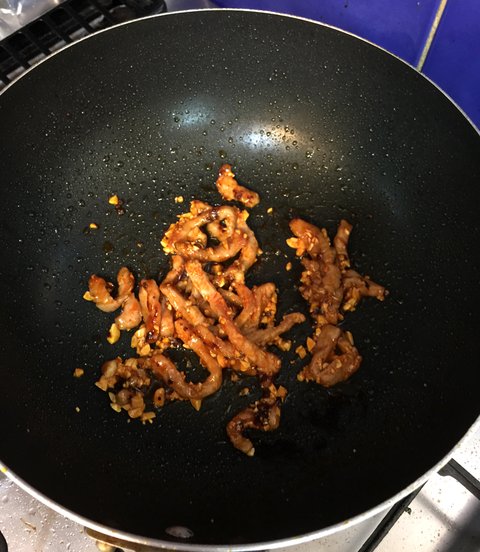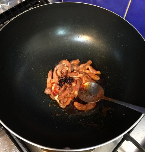 고추기름을 넣고 돼지고기 잡채용 밑간한것을 넣고 볶아주세요