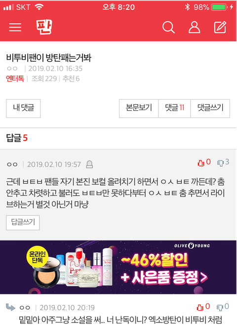 아니 ㅋㅋㅋㅋㅋ 다른 글 보다가 발견했는데 내 글이 타남돌 보컬 후려쳤다는데??? 내가 타 남돌 보컬 후려쳤어? 수정 전 내글 내용 그냥 비투비가 타 남돌(두그룹 예시를 들었지) 처럼 안무가 개빡센건 아니지만 그래도 다른 남돌 하는 만큼은 한다는 내용이었는데 그게 후려치는거야??