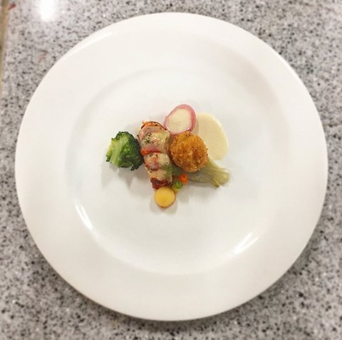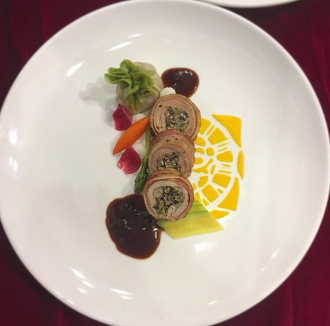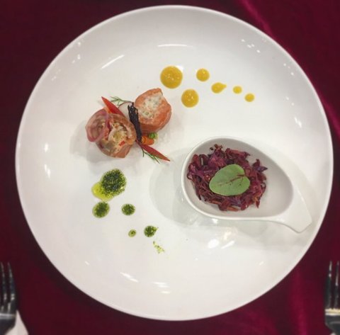 메인 요리인데 배추만두랑 돼지고기롤라드,크랜베리소스,단호박퓨레로 만든거야