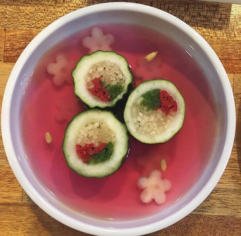 오미자물에 오이안에는 무,홍고추,풋고추가 들어가고 겉에 장식으론 배랑 잣을 띄웠어