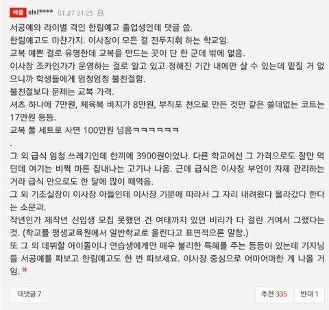그렇다고 서공예도 좋은 학교도 아니지 않냐... 서공예는 좋은 줄 알았는데 여기도 쓰레기... 한림이랑 마찬가지로 교복 맞추는 곳 한 곳 밖에 없다고 들었음 진짜 순수하게 음악 하고 싶은 사람들은 다른 예고 찾아야 할 듯......