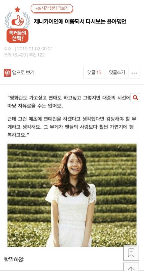 안티 혼자 북치고장구치고하는거 알겠는데 이 글만으로도 윤아 클라스나온다ㄷㄷ 윤아 자체는 깔게없으니 털어서 나온 먼지라도 잡아 까달라고 반년전 판댓글까지 긁어올수밖에 없음ㅋㅋ 인터넷 세상 속 조그만 판에서 '걔 팬덤'혼자 발악해봤자 윤아 롱런하는 답나옴