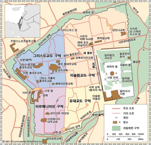 예루살렘에서 이슬람교 유대교 기독교인들이 구역을 나누어 모임..