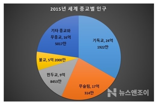 기독교 24억 무슬림 17억 유대교 약 2300만 . 총 41억 2300만.
