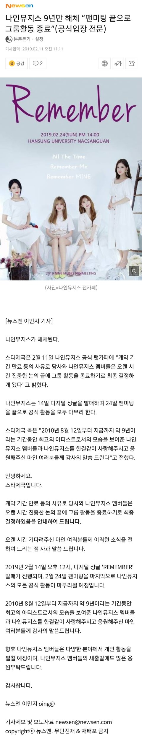 나인뮤지스 9년만 해체 "팬미팅 끝으로 그룹활동 종료”(공식입장 전문)