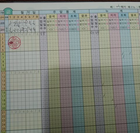 출석부 증거 첨부합니다. 분명 조퇴 혹은 병결등 출석부에 체크 되어 있는 상황임에도 선생님께서 도장을 찍어 없애시거나 나이스에 올리지 않고 있는 상황임이 확실합니다. 꼭 이 일이 공론화 되었으면 좋겠습니다.