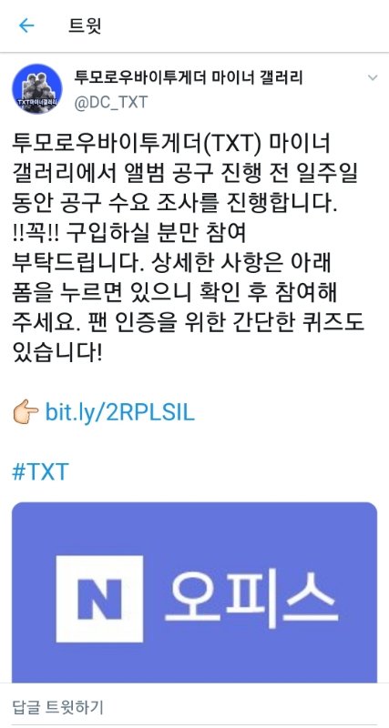 짹에서 봤는데 txt 마갤에서 총대 잡고 공구할건가봐 참고로 공구하면(=공동구매하면) 더 저렴한 가격에 앨범 살 수 있어 자기가 꼭 살 수량만큼만 투표해줘!
