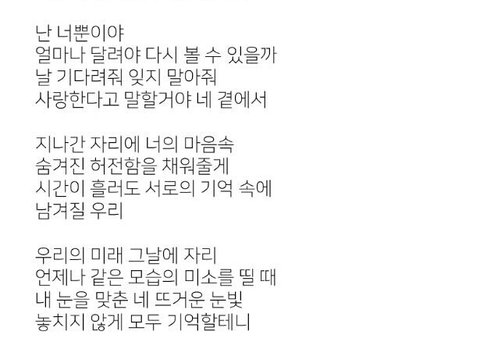 현실적으로 리더는 이미 군생활 중이고 당분간은 단체 활동을 보기 어려울 거라고 예상되는 상황에서, 자신들을 기다리고 잊지 말아준다면 다시 돌아와서 사랑한다고 말할 거라는 감동적인 가사도 담고 있어.