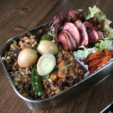 2. 두번째로는 어제 반찬으로 담았던 소고기 간장조림을 넣은 볶음밥과 훈제오리 메추리알 장조림입니다.