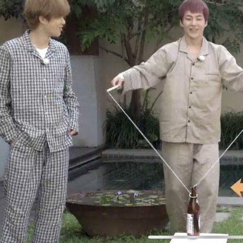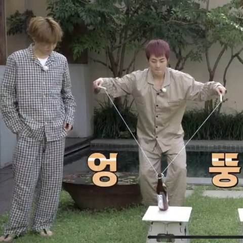 양손으로 성공하고 뿌듯해하는 민석이와 오~하면서 쳐다보는 준면이