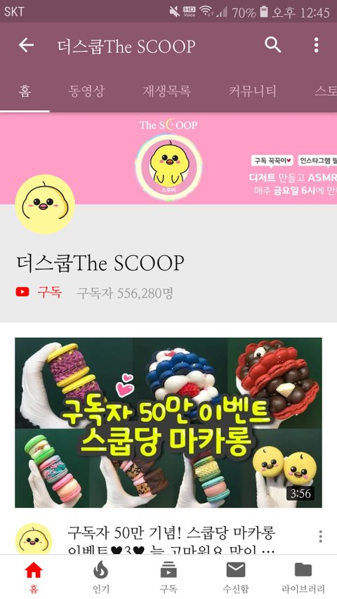 초딩 때 스쿱님 영상 보면서 나도 홈 베이킹 하고 싶다고 생각했는데 나 벌써 17살이다...ㅋㅋㅋㅋㅋ 시간 개빨라 아이스크림 퍼낼 때 쓰는 스쿱으로 쿠키 만드시는 거 보고 신기해서 구독 눌렀을 때는 만 명도 안 됐던 것 같은데 중딩때 잠깐 안 보다가 며칠전에 보니까 50만명이 넘으셨어 그리고 무엇보다 지금은 줄서서 먹는 마카롱 가게 사장님이시궄ㅋㅋㅋㅋㅋㅋ 포항이랑 멀어서 한 번도 안 먹어봤는데 진짜 꼭 먹어보고 싶어 매일 인스타로 보면서 눈물 흘리고 있다