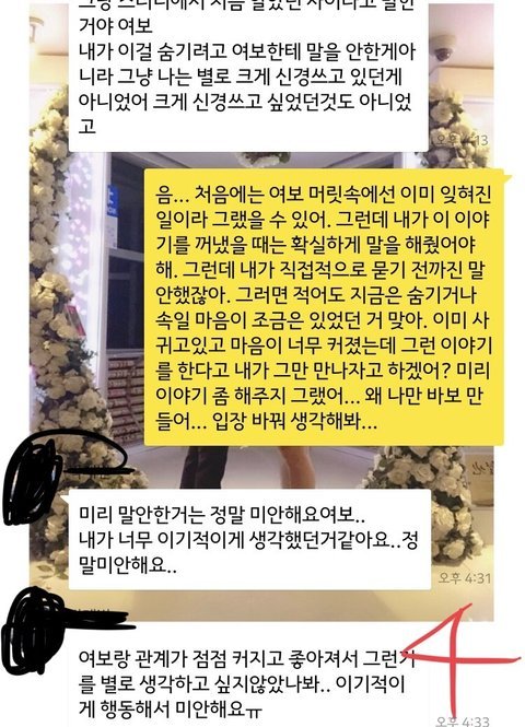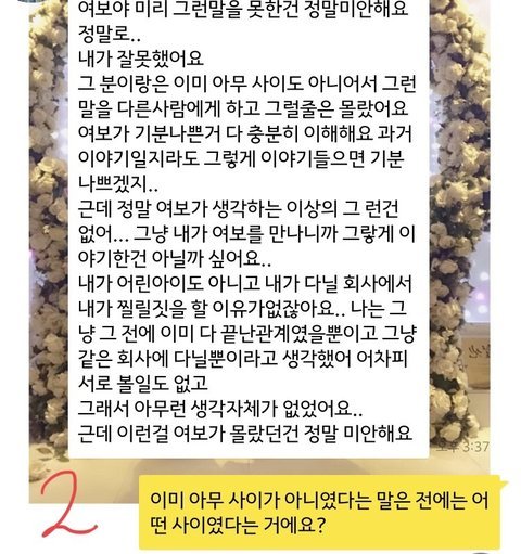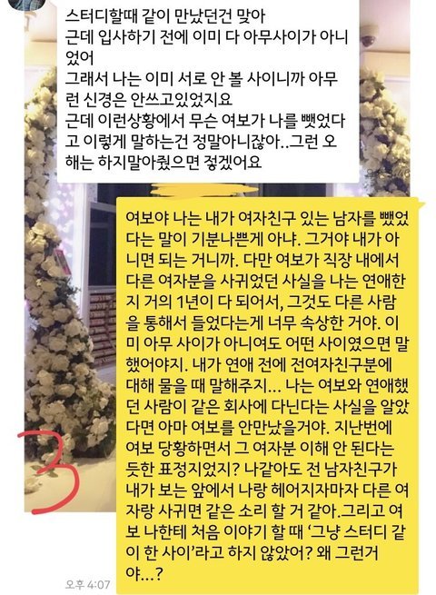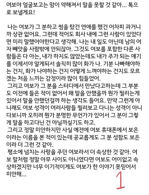누구나 그렇겠지만 내 연인은 항상 좋은 사람이기에 저도 어떻게 하다하다 저런 소문까지 도나 싶었습니다. 물론 한편으론 기분이 굉장히 나쁘고 당황스러웠구요. 이후 심난해진 마음으로 남자친구를 보니 티가 났나봅니다. 화가 났는지, 왜 그러는지 묻는 남자친구에게 돌직구로 물었습니다. 이런 소문을 들었다고. 그랬더니 스터티에서 처음 만났다고 하더군요. 그래서 아 썸만 탄거구나. 그래도 말을 했어야지 싶어서 시간을 두고 재차 물었습니다. 그랬더니 만났던 사이이고, 입사한지 얼마 지나지않아 전 여자친구분께서 퇴사를 하셔서 머릿속에서 잊혀져 말할 이유가 없다고 생각했답니다.