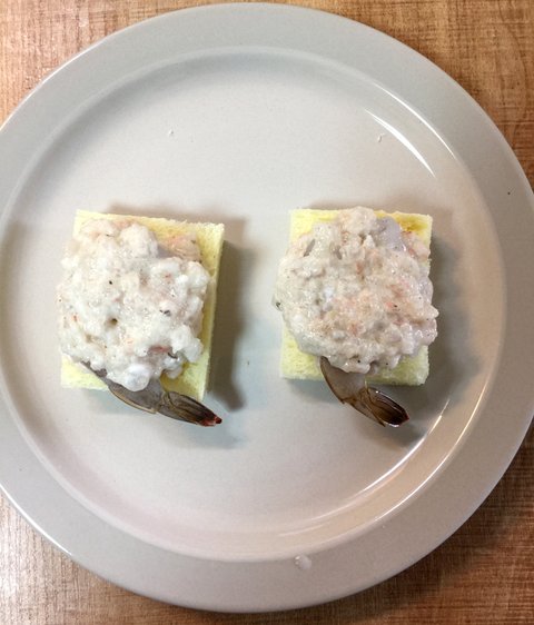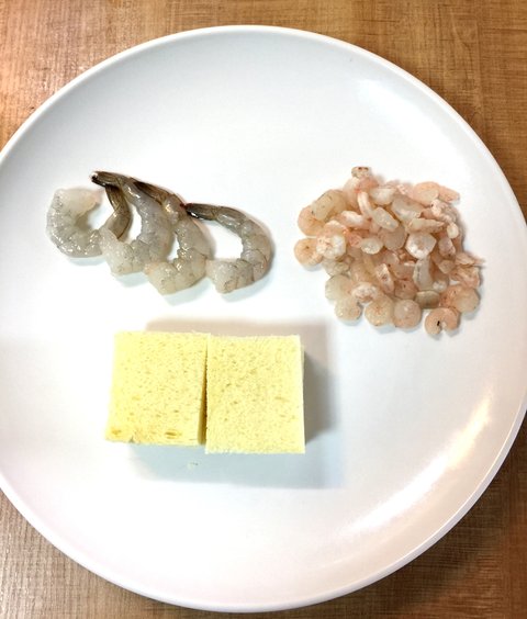 얇게 다진새우를 빵위에 올리고 그 위에 큰새우를 올린후에 다시 다진새우를 올리세요