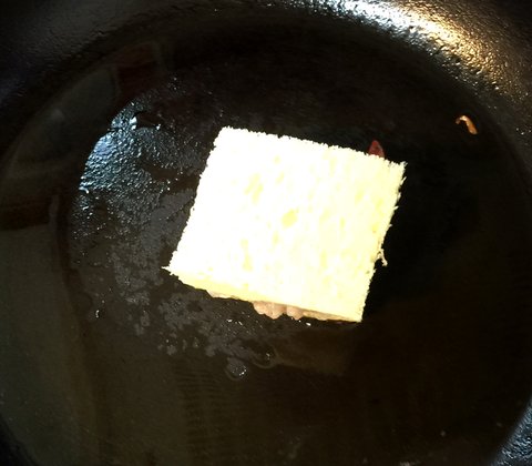 전자렌지에 익힌 멘보샤를 버터나 마아가린을 녹인 후라이팬에 올려서 익히는데요