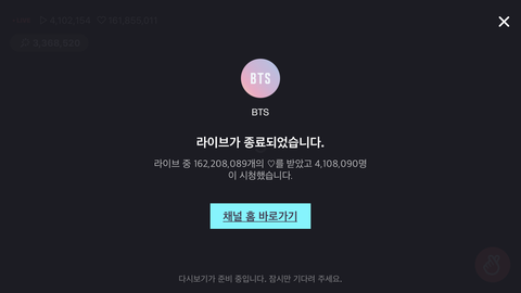 방금 슈가가 브이앱라이브하길래 방탄은 라이브에서 무슨얘기하나 궁금해서 들어갔는데 400만명됐으니까 끄겠다고하고감..근데 보통 라이브 400만씩 안보지않냐 하트도 1억넘음 개부럽네 내본진도 저렇게되면 좋겠다ㅜ